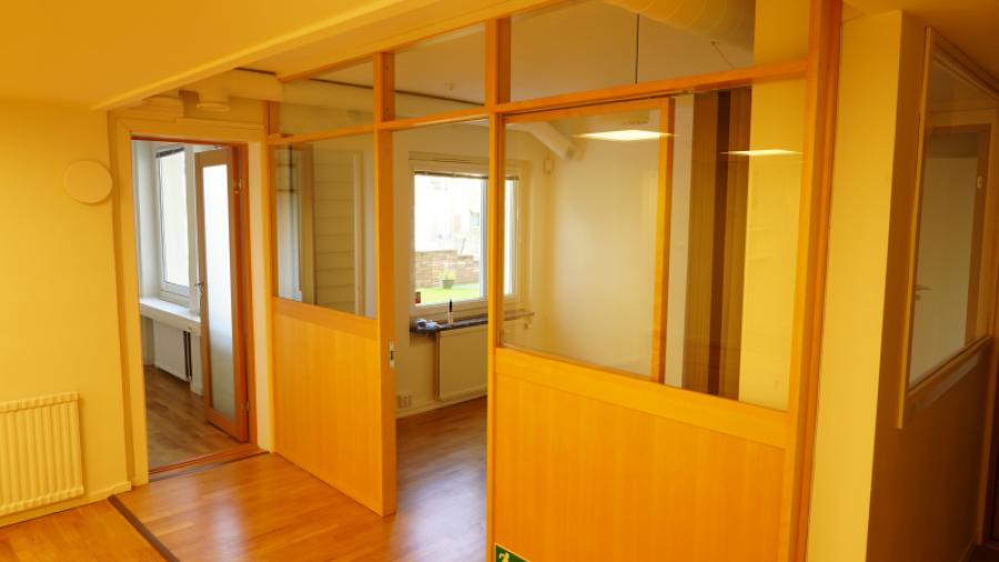 Fem rum totalt, tre kontorsrum vetter mot Trädgårdsgatan (Sofiakyrkan), det fjärde och ett
